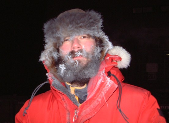 Not exactly a glamour shot, but a bit amusing I think. Ice had accumulated in my moustache, beard, the brim of my fur cap, and around my parka collar. What wasn't so funny, or at least at the time, was how hair from my moustache and the area immediately below my lower lip had matted together in a ball of ice. Essentially, it served to weld my mouth shut. It was only after a bit of careful manipulation was I able to get my lips safely apart, and even then it was at the expense of a few hairs.